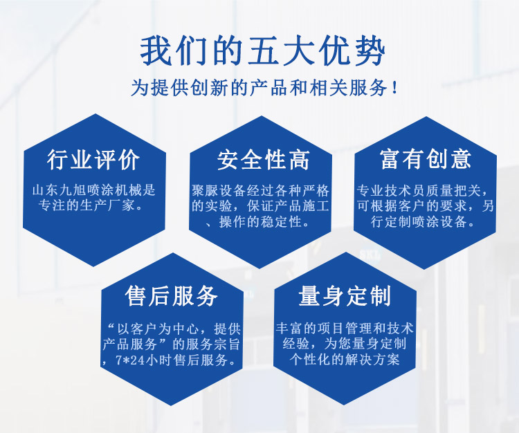 目前山東九旭機(jī)械設(shè)備已領(lǐng)跑中國(guó)液壓聚脲設(shè)備行業(yè),價(jià)格合理成為廣大客戶之首選。液壓聚脲噴涂機(jī)廠家所銷售產(chǎn)品主要來自國(guó)內(nèi)及國(guó)際知名品牌,產(chǎn)品性能優(yōu)良,價(jià)格合理,專業(yè)的技術(shù)和完善的售后服務(wù)贏得國(guó)內(nèi)外眾多客戶的誠(chéng)摯贊賞........